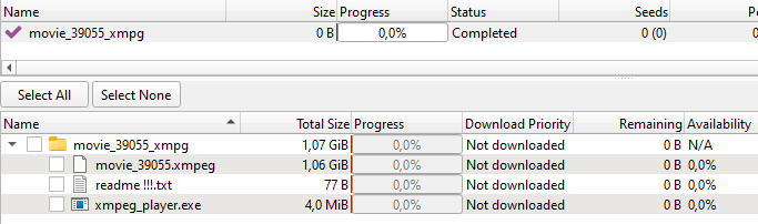 When a user downloads a torrent file from an infected site, they get a small folder that contains what looks like a movie file with the .xmpeg extension. You can’t open a file in that format without a “special media player”, which is conveniently included in the folder. In reality, the “player” is a Trojan installer.