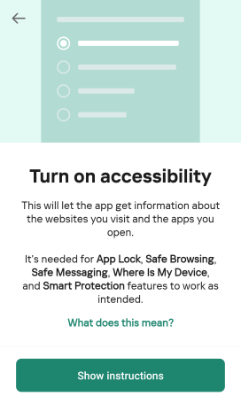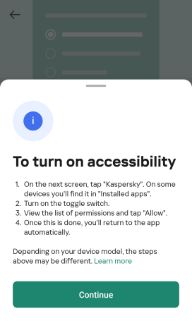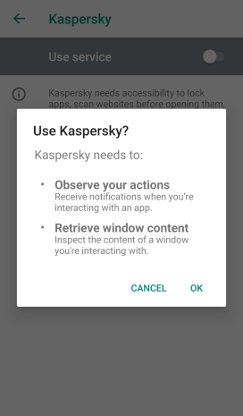 To give Kaspersky for Android the permissions it needs to find and repel threats, you need to enable certain settings in the Android OS. The first step is to turn on access to Accessibility features, which is required for all layers of security. If you don’t grant this permission, the app will warn you and provide instructions. You can also enable it manually: Settings → Accessibility → Kaspersky → Use Service → OK.