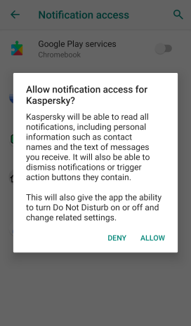 - Grant notification access: Settings → Apps & notifications → Special app access → Notification access → Kaspersky → Allow.